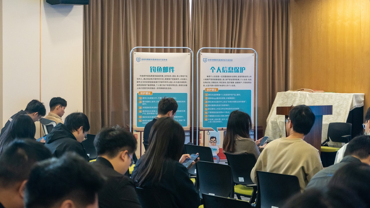 除領(lǐng)取安全知識(shí)手冊(cè)及觀看了網(wǎng)絡(luò)安全知識(shí)展外,與會(huì)代表還認(rèn)真聽取了由協(xié)會(huì)特邀講師:北京天融信科技集團(tuán)高級(jí)安全顧問張鵬昆,深圳市科盾科技總經(jīng)理劉佳,分享的《新應(yīng)用新技術(shù)帶來的網(wǎng)絡(luò)安全新挑戰(zhàn)》和《基層單位輿情應(yīng)對(duì)技巧》。兩位講師從當(dāng)前網(wǎng)絡(luò)安全形勢(shì)、常見的網(wǎng)絡(luò)安全威脅與案例、日常工作生活中的安全意識(shí)、網(wǎng)絡(luò)安全法律法規(guī)以及基層單位網(wǎng)絡(luò)輿情應(yīng)對(duì)等方面,為大家做了詳細(xì)介紹。