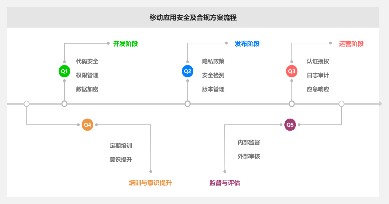 本方案涵蓋開發、發布、運營三大階段及培訓與意識提升、監督與評估兩大支撐環節。開發階段注重代碼安全、權限管理、數據加密;發布階段強調隱私政策明確、安全檢測嚴格、版本管理規范;運營階段則需要重視認證授權、日志審計、應急響應機制的建立。此外,通過定期培訓提升開發人員安全合規意識,內部監督與外部審核相結合,確保應用全生命周期的安全合規性,促進應用的健康發展與用戶隱私保護。