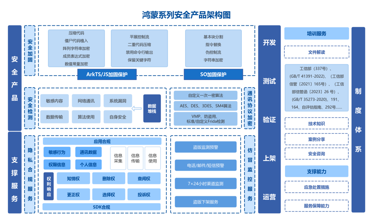 為了支撐這方案,我們鉆研并提供了一系列鴻蒙安全產品及服務。這些產品與服務涵蓋了從代碼保護、漏洞掃描、通訊協議加密、隱私保護、安全運維到制度體系等多個方面,為鴻蒙移動應用提供了全方位、多層次的安全保障方案。不僅能夠幫助開發者在開發階段就有效識別和修復潛在的安全漏洞,還能在發布和使用過程中持續監控和防護,確保應用的安全穩定運行。